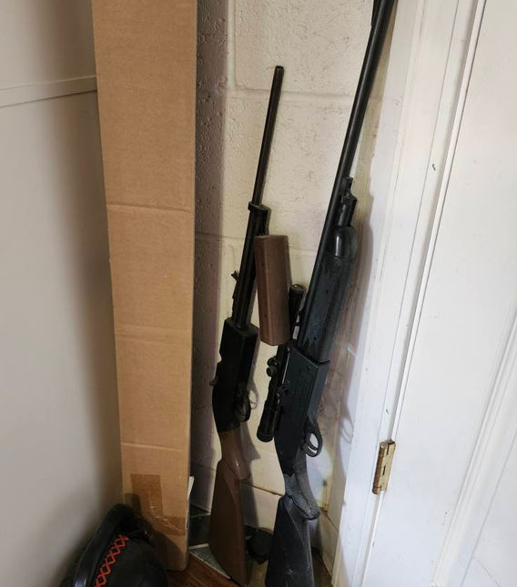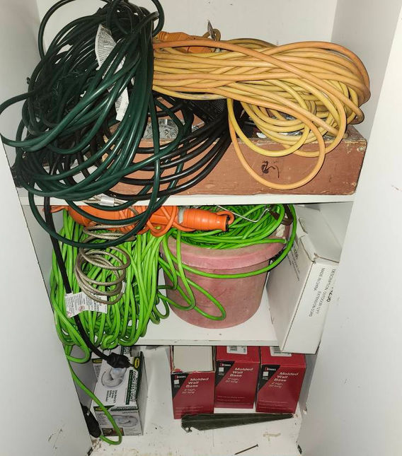Knife collection; 8 ft. fiberglass ladder; Adjustable ladder; 6 Ft. step ladder; Air compressor; Screen door; Lawn & garden tools; Wheel barrow; Shelves; Tomato cages; Deck storage box; Outdoor deco; Patio furn; Foldable saw horses; Garden fence; Rechargeable stun baton; Bull horn; Baseball cards; Dumb bells; 4 Portable power sources; BB guns; Tool box and several hand tools; Socket sets; Large trash cans; Garden hose; Hose reel; Covered garden planters; Many other misc items.